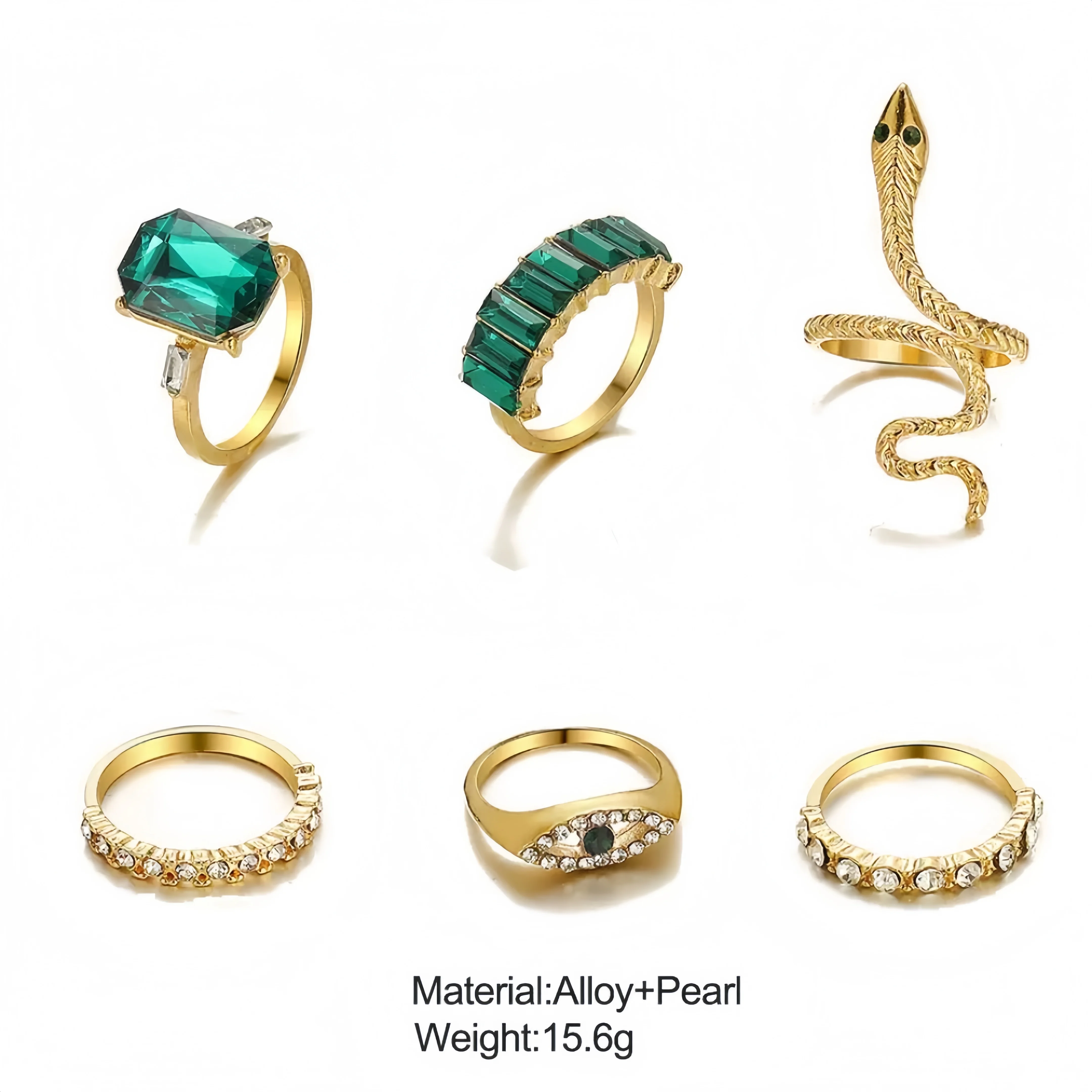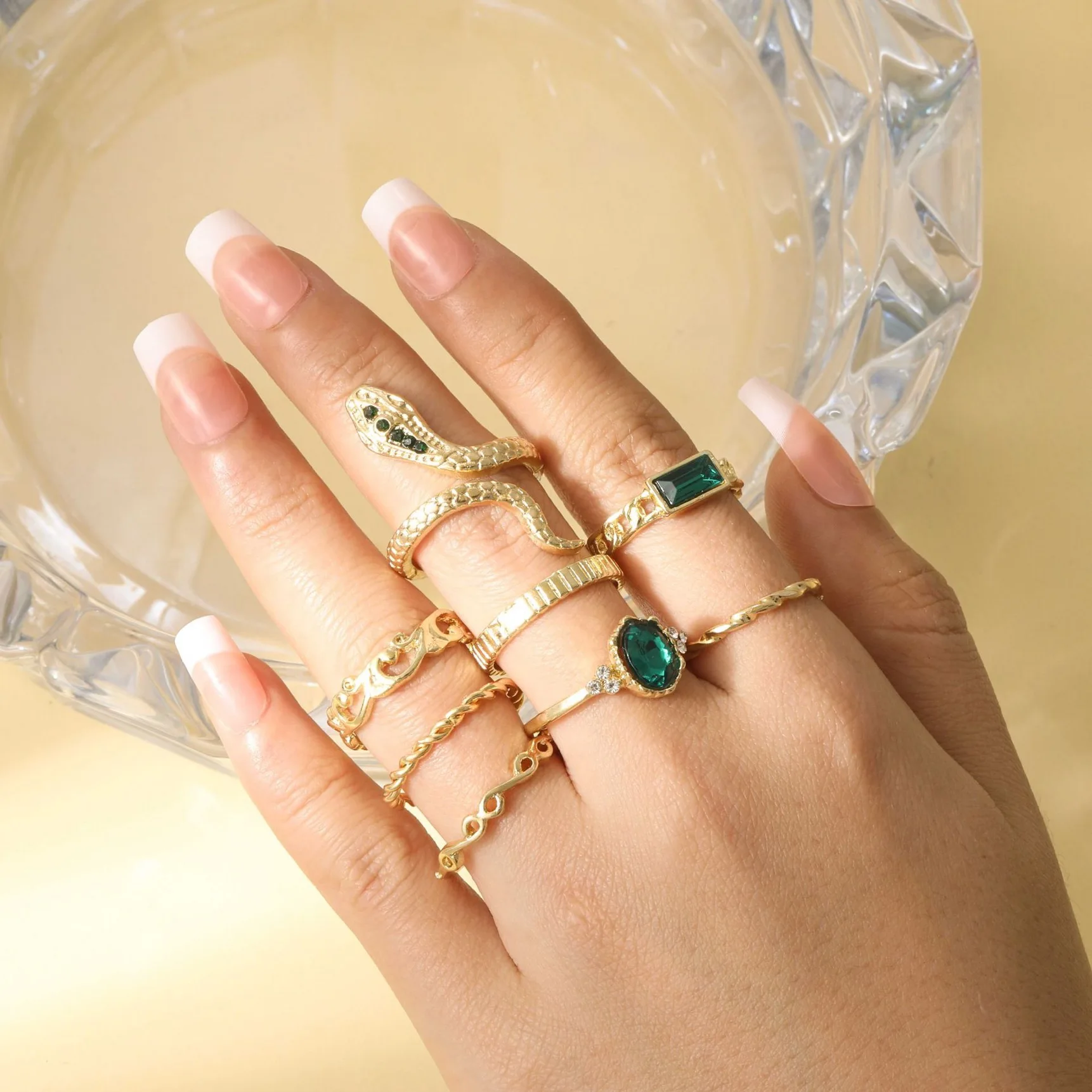 Fashionable 8-Piece Snake Twist Ring Set with Rhinestone Inlay